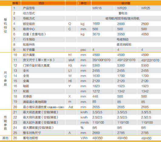 麥克納姆輪全方位任意移動;雙液壓缸前移機(jī)構(gòu)門架前移更加穩(wěn)定可靠;搖擺式轉(zhuǎn)向橋,克服地面坑洼不平帶來的影響;搭載激光導(dǎo)航、磁導(dǎo)航、視覺導(dǎo)航等系統(tǒng), 實現(xiàn)智能無人化;手動遙控實現(xiàn)定位精度達(dá)到±0.5mm; 個性化定制起升重量以及堆垛高度;可選裝叉車常用屬具,工作范圍更廣;根據(jù)客戶要求,可選配鉛酸蓄電池或鋰電池;
