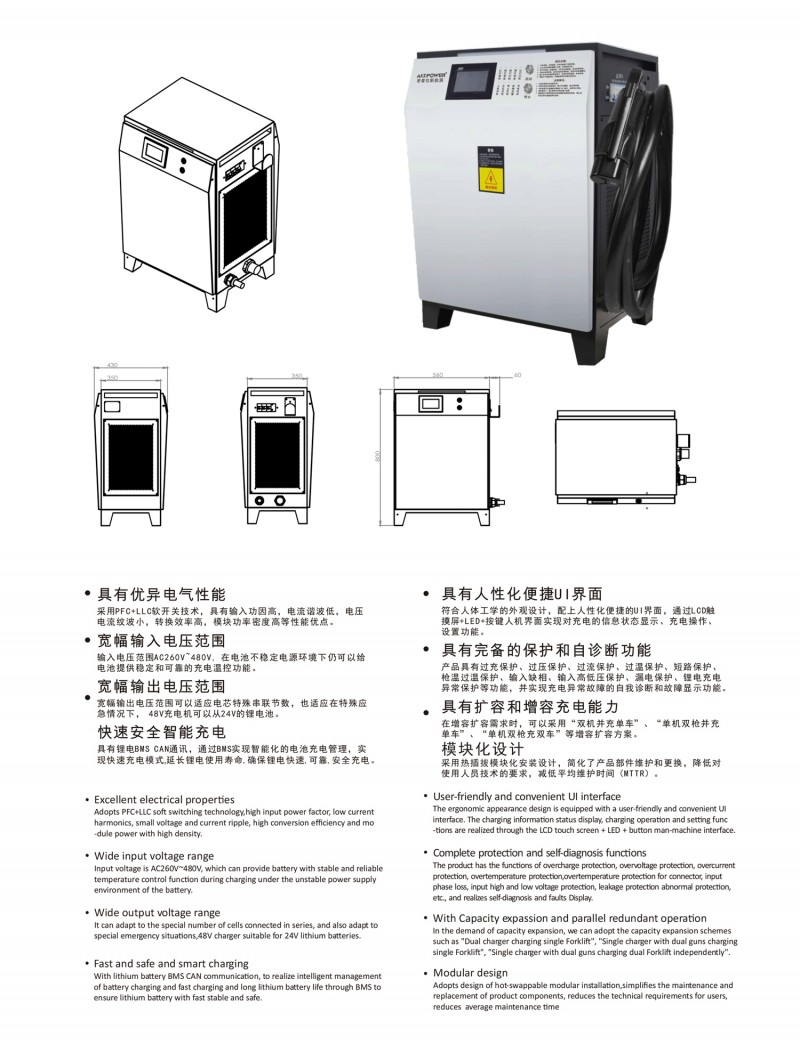 觸摸屏智能操作設計:告別傳統(tǒng)按鍵方式,給您帶來更現(xiàn)代更具科技智能的操作體驗 自動充電:插槍自動充電,簡化充電流程,便于操作 兼容性高:80V200A兼容48V200A充電 多重保護: 輸出短路,過流過壓保護,反接保護,電流導管保護等多重保護 預約充電功能:避開高峰用電時段,有效節(jié)省成本 雙語切換:中英文雙語隨需切換,跨越語言障礙,與世界接軌 人性化設計:充電機背板內(nèi)部附部件明細及產(chǎn)品接線圖,方便客戶可更清楚的了解產(chǎn)品,便于維修,提高售后時效 獨特設計: 內(nèi)置電磁鎖驅動模塊,防止臨時斷電鎖槍 使用壽命更長:功率模塊預留20%空間,提高模塊的使用壽命 出色內(nèi)部結構: 內(nèi)部結構左右出風,內(nèi)部電路不容易積粉塵,提高充電機壽命