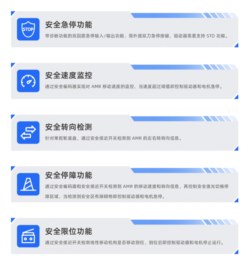 這就意味著通過 SRC-3000FS,無需安全“PLC”,即可搭建滿足 ISO 3691-4 國際安全標準的 AMR!由 SRC- 3000FS 打造的 AMR 性能強悍的同時空間更加緊湊,這不僅降低造 AMR 的難度,還能為客戶提供更多樣的造車選擇,為國產 AMR 提供強有力的技術支持,促進 AMR 行業繁榮發展!