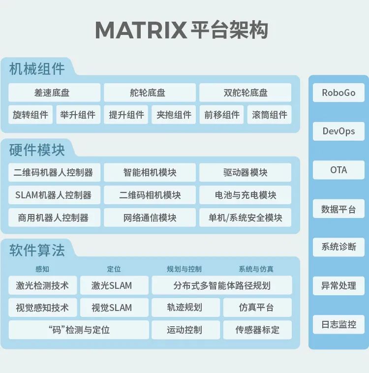 極智嘉MATRIX平臺主要分為軟件算法、硬件模塊和機(jī)械組件三個(gè)層次: