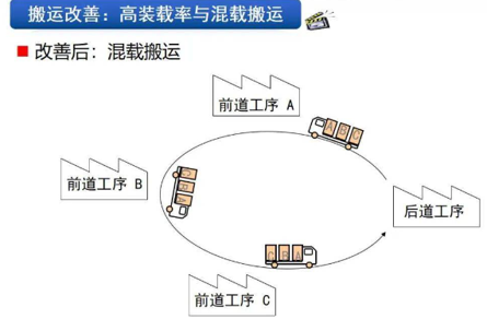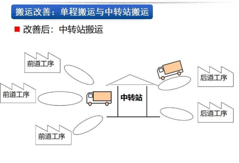 · 搬運(yùn)改善后采取的混載搬運(yùn)、接力式搬運(yùn)、中轉(zhuǎn)站搬運(yùn)均起到了大幅提高效率,降低人工成本的作用