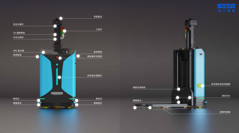 仙工智能 SRC 系列核心控制器打造的激光 SLAM 智能叉車整車實(shí)現(xiàn)多種傳感器的超高配置,360° 立體安全防護(hù),提升了 AMR 運(yùn)行過程中的安全等級(jí),包括:導(dǎo)航激光、前后避障激光、安全觸邊、距離傳感器、急停按鈕、3D 避障相機(jī)等。