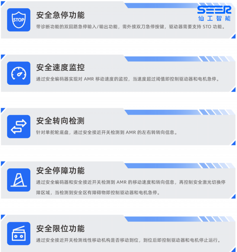 仙工智能以智能控制器和數(shù)字化軟件為核心的產(chǎn)品組合中,將安全作為第一要義,從產(chǎn)品研發(fā)到產(chǎn)品測(cè)試到最終交付,始終貫徹安全守護(hù)課題,為客戶打造更安全的 AMR。