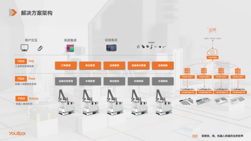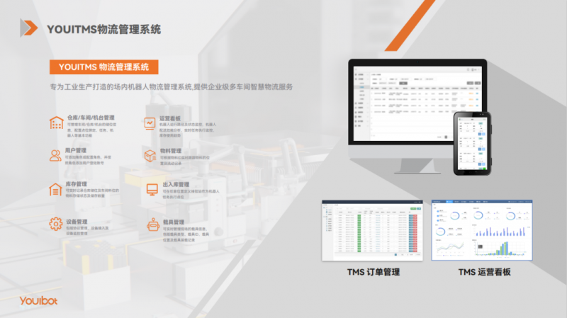 在移動機器人基礎上,優艾智合智慧物流管理系統YOUI TMS與企業MES、WMS等信息化系統對接,100%追蹤回溯每一件物料信息,完成物料從備料倉到產線再到成品倉的完整閉環,在提質增效的基礎上幫助企業實行柔性生產與數字化管理。