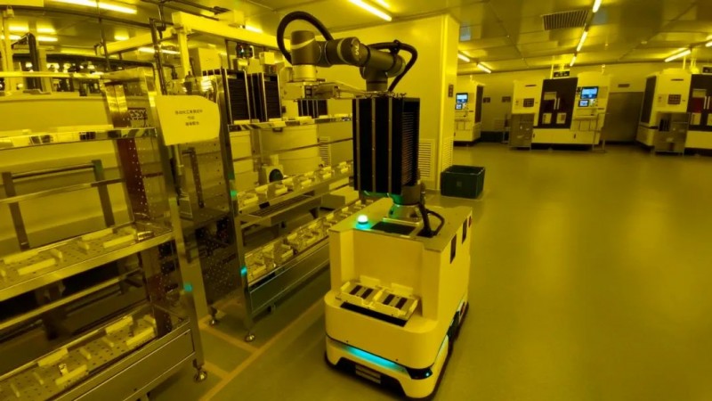 優艾智合應用彈夾轉運機器人,在黃光一體化車間“印刷-顯影-曝光”工藝流程間的自動上下料、空籃回收、緩存管理作業。