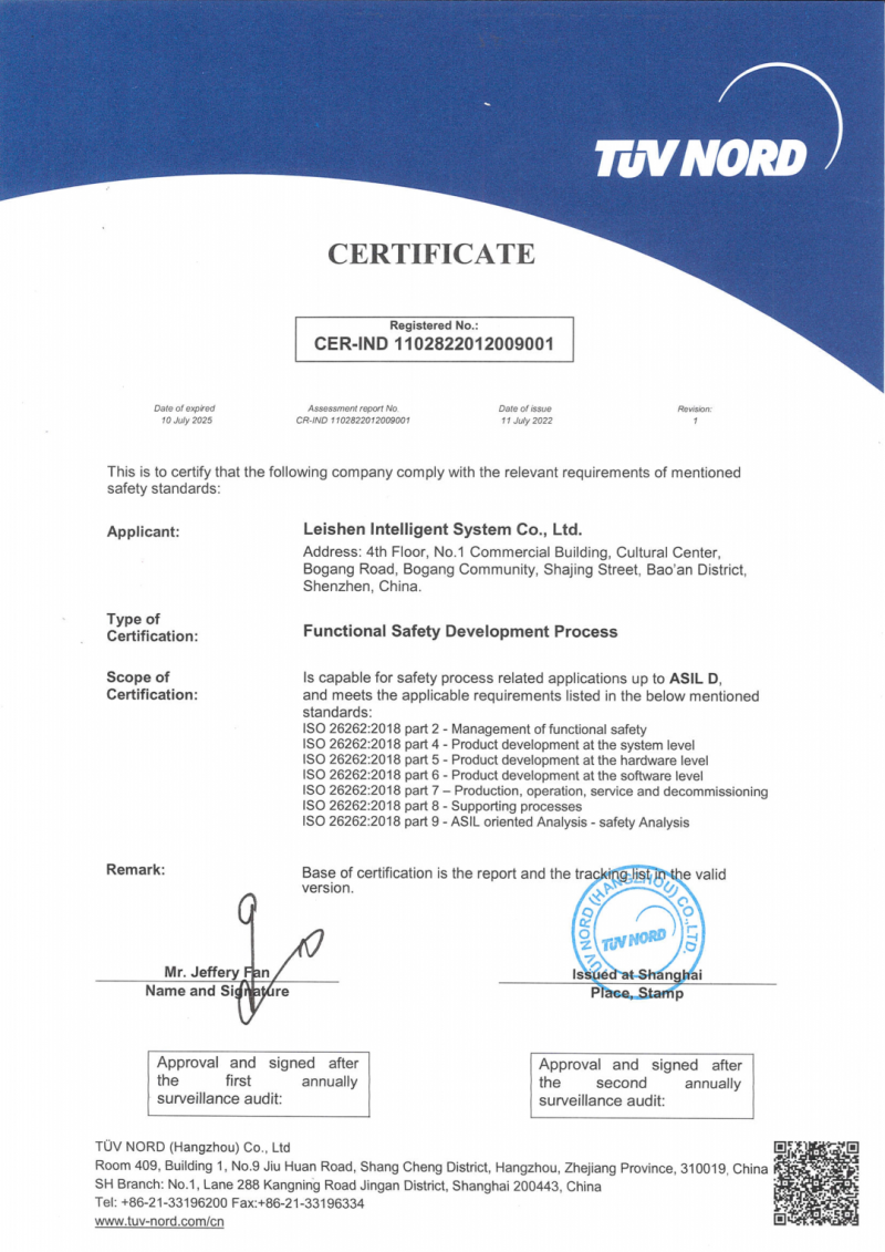 核心提示:7月14日,鐳神智能獲得由TüV NORD 頒發(fā)的ISO 26262:2018汽車(chē)功能安全流程認(rèn)證證書(shū),且獲得ASIL D最高等級(jí)認(rèn)可!(ASIL有四個(gè)等級(jí),分別為A、B、C、D,其中 D是要求最嚴(yán)苛的等級(jí))。