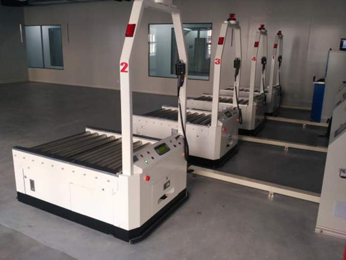 化成分容段采用輔助定位,保證側(cè)向背輥AGV與輥筒輸送機(jī)的精準(zhǔn)對接。化成分容段和組裝烘烤采用光通訊交互,實(shí)現(xiàn)AGV背輥和輥筒輸送機(jī)的同步傳動。AGV通道狹窄,對AGV的導(dǎo)航穩(wěn)定可靠性、定位精度有極高的要求。化成分容庫AGV運(yùn)行通道狹窄(寬2.8米),因此要求AGV設(shè)計(jì)比較小巧,滿足通道內(nèi)雙向運(yùn)行需求。化成分容庫AGV側(cè)面滾筒裝卸貨的設(shè)計(jì),更符合現(xiàn)場多物流線多站臺的作業(yè)模式,能夠在站臺裝完即走。化成分容庫AGV四面防護(hù)的透明亞克力板罩設(shè)計(jì),能有效隔離灰塵,同時滿足人工抽樣檢測電池的需求。