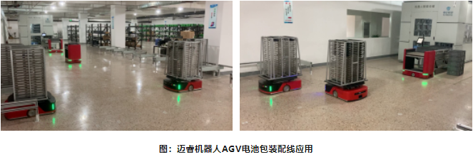 該項目位于溫州樂清,AGV主要應用于動力電池組裝配線。該項目主要特點是對接多種自動化設備,多車型混合調度。通過對潛伏舉升式AGV進行改造,滿足現場多種載具在多種自動化設備上的對接及搬運,同時搭配滾筒式AGV實現料箱在輸送線上的移載。AGV與自動化設備的對接,使生產更加柔性化,同時利用邁睿自研的調度算法,實現了多車型在不同自動化設備間的高效率調度,給客戶帶來了很好的經濟效益和社會效益。
