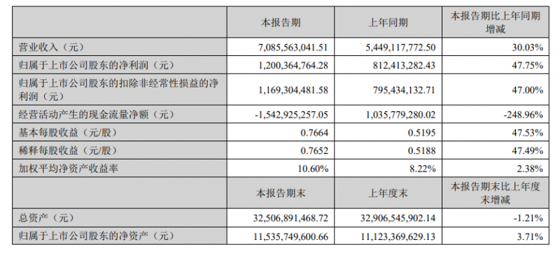 先導(dǎo)智能發(fā)布2023年半年度報(bào)告,該公司營(yíng)業(yè)收入為70.86億元,同比增長(zhǎng)30.03%。歸屬于上市公司股東的凈利潤(rùn)為12億元,同比增長(zhǎng)47.75%。歸屬于上市公司股東的扣除非經(jīng)常性損益的凈利潤(rùn)為11.69億元,同比增長(zhǎng)47.00%。基本每股收益為0.7664元。報(bào)告期,設(shè)備驗(yàn)收較多,營(yíng)業(yè)收入增加。