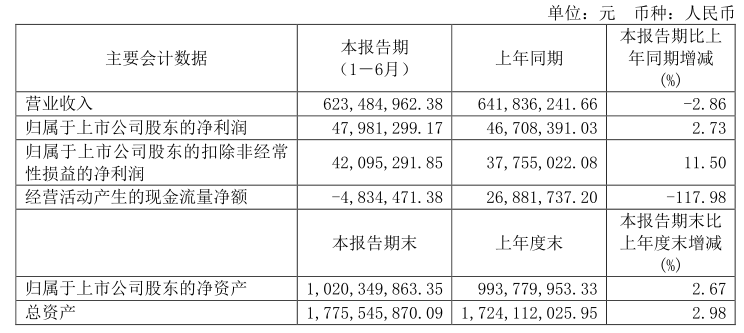 德馬科技8月20日晚間發(fā)布半年度業(yè)績(jī)報(bào)告稱,2023年上半年?duì)I業(yè)收入約6.23億元,同比減少2.86%;歸屬于上市公司股東的凈利潤(rùn)約4798萬(wàn)元,同比增加2.73%;基本每股收益0.4元,同比增加2.56%。