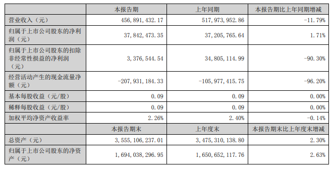 東杰智能8月29日發(fā)布半年度業(yè)績(jī)報(bào)告稱,2023年上半年?duì)I業(yè)收入約4.57億元,同比減少11.79%;歸屬于上市公司股東的凈利潤(rùn)約3784萬(wàn)元,同比增加1.71%;基本每股收益0.09元,同比增加0%。