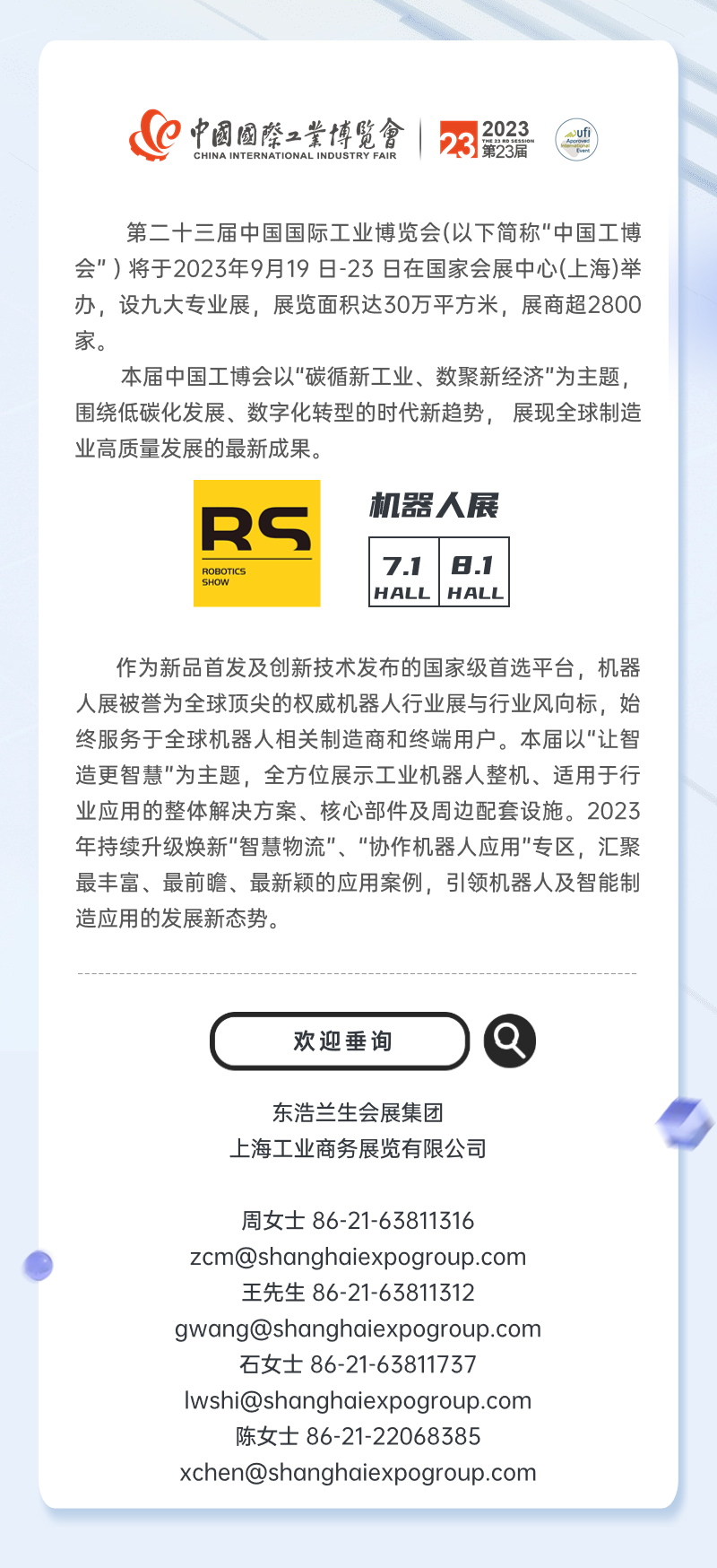 總而言之,今年來中國工博會機器人展,可以看到海內外機器人知名品牌,可以看到全球首發/亞洲首發/中國首展新品,可以看到最前沿最熱門的行業應用,您既可以感知機器人最新發展趨勢,又可以和機器人進行互動體驗,還有直播帶貨、直播采訪、直播新品發布等線上活動。中國市場瞬息萬變,但在中國的中外機器人品牌不斷提高性能和產能,創新發展,為更高效、更先進、更柔性的制造工藝助力,更好地應對全球趨勢,在持續的變化中保持領先。