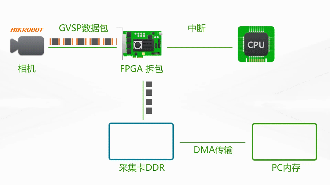 MV-GE1104卡端采用FPGA方案,在采集卡上即可對相機傳輸?shù)腉VSP數(shù)據(jù)包進行拆包組幀,直接通過DMA傳輸,直接將圖像數(shù)據(jù)拷貝至PC內(nèi)存中,從根本上解決了網(wǎng)絡(luò)傳輸?shù)膩G包問題。這種傳輸模式幾乎對PC負載沒有消耗,可在CPU滿負荷工作時依舊保持?jǐn)?shù)據(jù)穩(wěn)定傳輸。