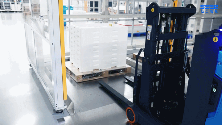 智能叉車可用于搬運、堆垛、舉升貨物,在該車間內(nèi)用于貨物跨區(qū)轉(zhuǎn)運。