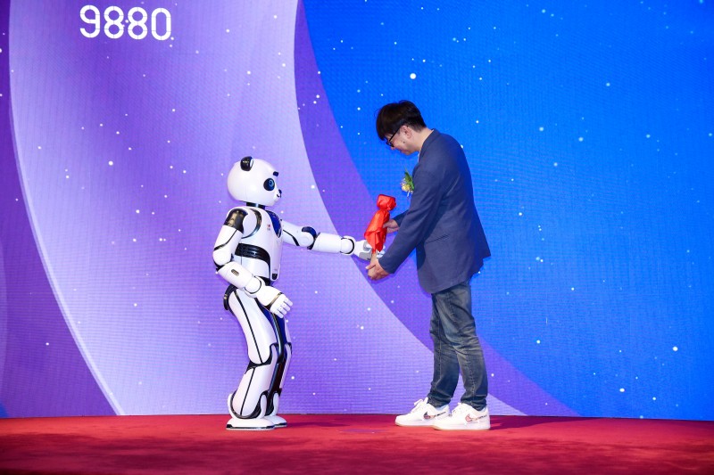 圖片2:熊貓機器人優悠將鑼錘遞給優必選董事會主席、執行董事兼行政總裁周劍