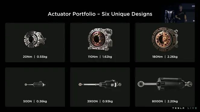 其中,有六種不同的執(zhí)行器,分別是三種旋轉(zhuǎn)執(zhí)行器和三種直線執(zhí)行器。根據(jù)特斯拉給出的數(shù)據(jù),在硬件中,旋轉(zhuǎn)執(zhí)行器占據(jù)最大的價(jià)值量。而要解決這一問(wèn)題,特斯拉最好的辦法就是自己生產(chǎn)執(zhí)行器,而這又涉及到研發(fā)與設(shè)計(jì)等一系列投入。