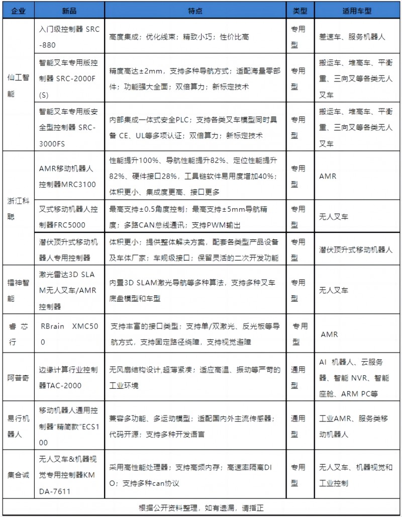 為不斷地適應行業(yè)發(fā)展變化,滿足本體企業(yè)發(fā)展業(yè)務需要,一些控制器廠商正在不斷迭代革新產品。根據(jù)新戰(zhàn)略移動機器人產業(yè)研究所不完全統(tǒng)計,2023年,國產移動機器人控制器廠商先后推出了10余款新品。