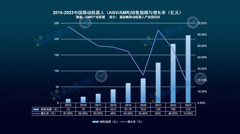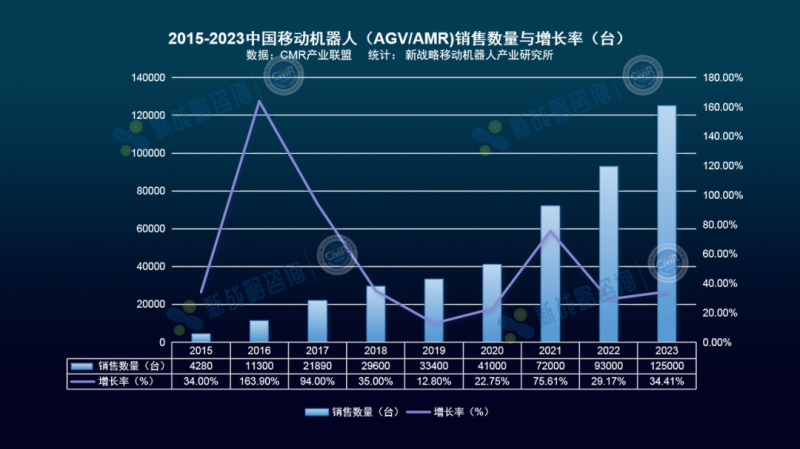 根據CMR產業聯盟數據,新戰略移動機器人產業研究所統計,從2015年至2023年,中國市場移動機器人(AGV/AMR)產業年復合增長率達43.18% ;2023年中國移動機器人(AGV/AMR)銷售規模212億,同比增長14.59%;銷售數量125000臺,同比增長34.41%。
