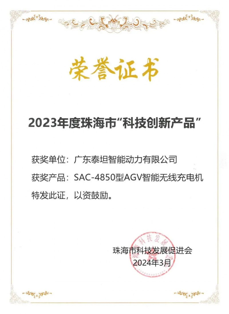3月29日下午,“創新珠海”科技獎暨科技創新評優頒獎典禮在珠海舉行。來自市科技創新局、市工業和信息化局、市民政局、市科協等有關部門負責人,企業、高校、科研院所和社會組織代表共計200余人參會。廣東泰坦智能動力有限公司憑借其基于磁耦合諧振式無線充電技術的自主全智能AGV充電系統研發及產業化項目獲得了2023年度珠海科學技術獎-自主創新促進獎三等獎以及2023年度珠海市科技創新產品獎。