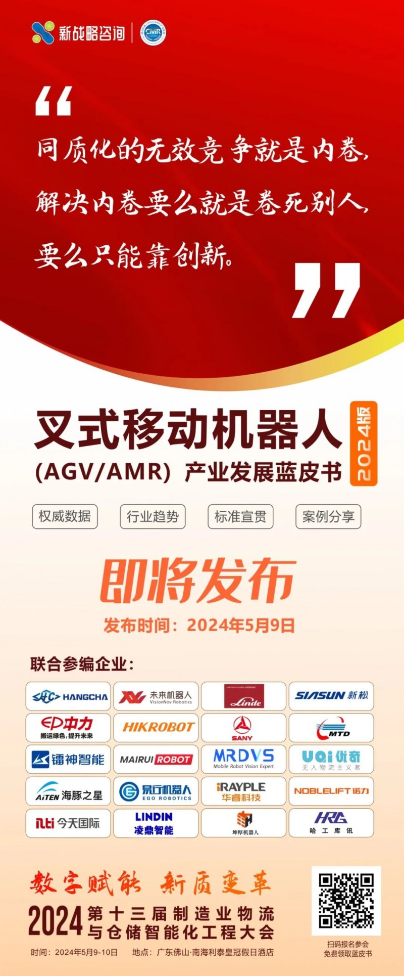 2024年,為了更好地探析當(dāng)前無(wú)人叉車市場(chǎng)最新發(fā)展情況及趨勢(shì),推動(dòng)無(wú)人叉車深入應(yīng)用,彰顯行業(yè)品牌力量,由CMR產(chǎn)業(yè)聯(lián)盟主編,杭叉智能、未來(lái)機(jī)器人、林德、新松、浙江中力、海康機(jī)器人、三一機(jī)器人、機(jī)科股份、鐳神智能、邁睿機(jī)器人、邁爾微視、UQI優(yōu)奇、海豚之星、易行機(jī)器人、華睿科技、上海諾力智能、今天國(guó)際、凌鼎智能、坤厚智能、哈工庫(kù)訊等20家無(wú)人叉車主流企業(yè)聯(lián)合編制的《叉式移動(dòng)機(jī)器人(AGV/AMR)產(chǎn)業(yè)發(fā)展藍(lán)皮書(shū)(2024版)》將在5月9日舉辦的“inktype="text" imgurl="" imgdata="null" data-itemshowtype="0" tab="innerlink" data-linktype="2" hasload="1">第十三屆制造業(yè)物流與倉(cāng)儲(chǔ)智能化工程大會(huì)暨第二屆全球叉式移動(dòng)機(jī)器人峰會(huì)”上正式發(fā)布,參會(huì)人員可現(xiàn)場(chǎng)領(lǐng)取藍(lán)皮書(shū)紙質(zhì)版一份,敬請(qǐng)期待!