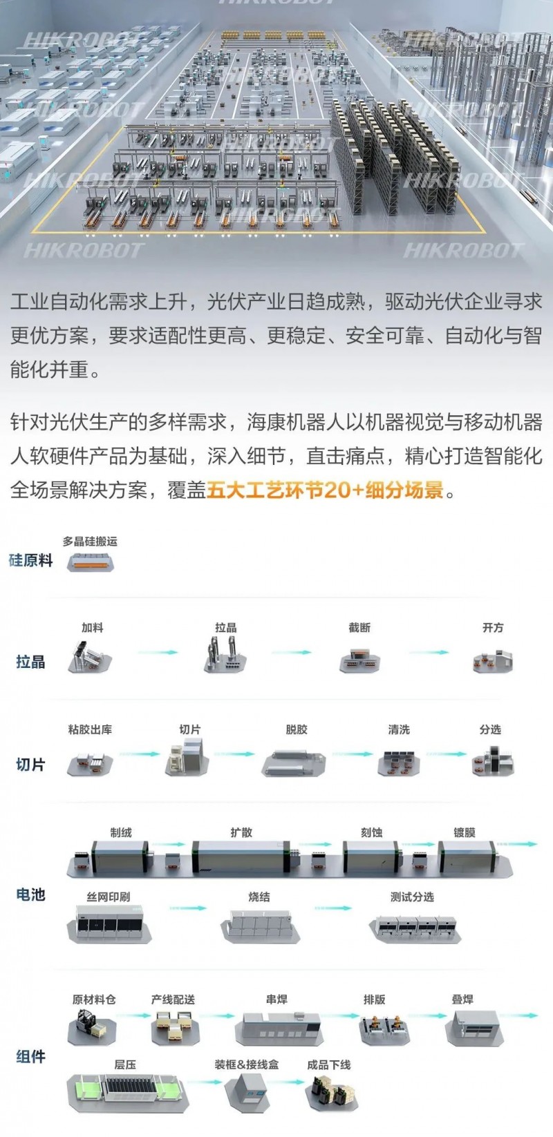 目前海康機器人已與包括通威、隆基、晶科在內的多家光伏頭部企業在智能制造方面進行合作。智能化全場景解決方案在諸多光伏項目中落地應用。