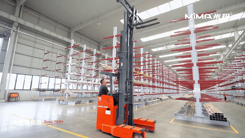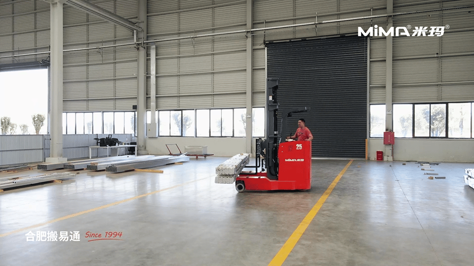 2、為了滿足長重物料的靈活搬運需求,建議客戶采購并使用MiMA米瑪窄體全向叉車MQ25,這款叉車額定載荷2.5噸,擁有多種行駛模式,側行通道更小,能夠完美適配窄巷道作業環境。