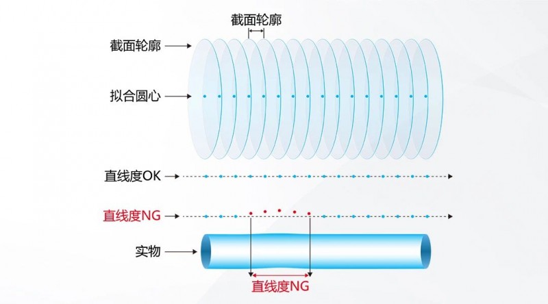 通過對截面數據的分析,可以計算出不同截面位置的圓心點坐標,進而實時監控線纜/管材直線度,當圓心坐標跳動超出一定閾值時,則判定線纜/管材某位置處發生彎折。