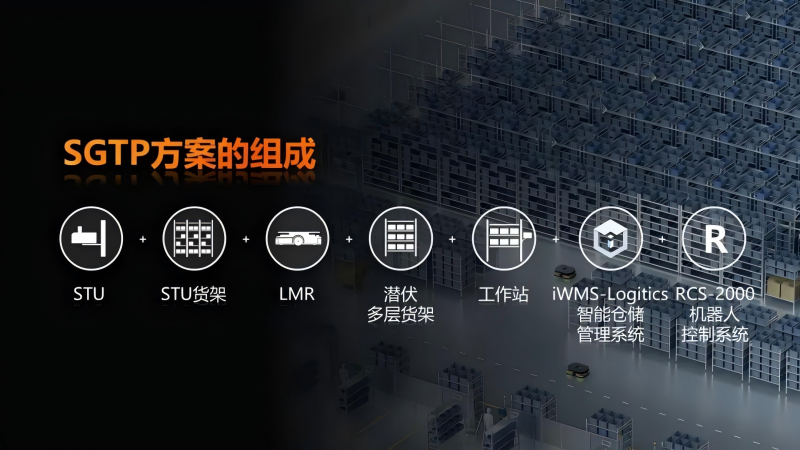 SGTP方案核心的由STU+高位貨架+ LMR+潛伏多層貨架+工作站構成,同時搭配iWMS-Logistics智能倉儲管理系統,以及RCS-2000機器人控制系統。