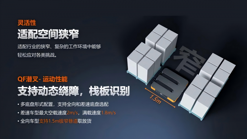 新一代Q1P的空載最高速度達4m/s,加減速性能大幅提升,兩車緊跟隨切換只需2s,揀選時切車換箱基本無感,減少任務切換的耗時浪費。同時無需輸送線,場地適應性和業務擴展柔性更強 。