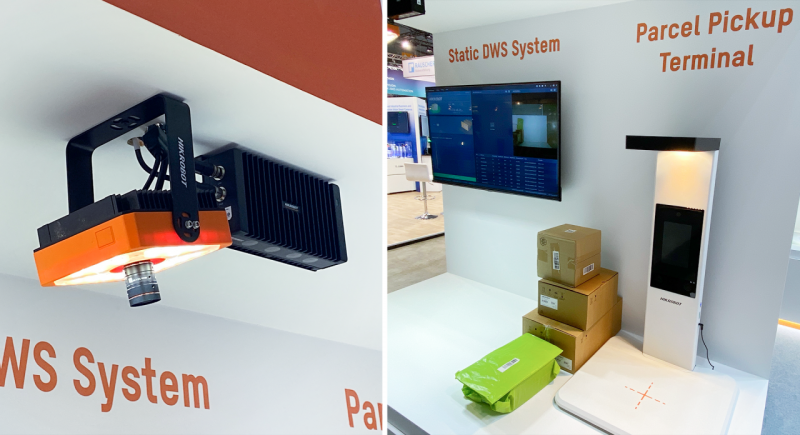 該區域展示了海康機器人靜態DWS方案:在物流信息收集過程中無需人工干預,可以自動收集基礎數據,適用于多種類型(如黑色、高反光、薄片、異形件等)包裹的體積測量。