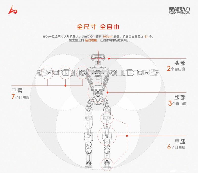 LimX Oli在這一點上沒有選擇“妥協式”的小尺寸方案,而是直接采用了165cm 的標準身高與31個機身主動自由度,構建出貼近人類軀體結構的通用人形構型。其自由度分布涵蓋: