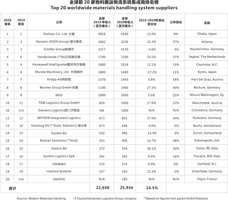 圖表:全球前20家物料搬運(yùn)系統(tǒng)集成商排名榜
