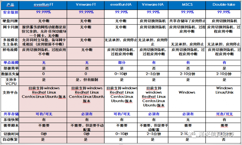 業(yè)界支持FT功能的有2家,為everRun FT和Vmware FT,從產(chǎn)品功能和成本分析考量,everRun更優(yōu);目前,業(yè)界無(wú)第三家支持FT功能的軟件,如下圖中MSCS,Double-take,均只支持HA功能,即業(yè)務(wù)會(huì)中斷,根據(jù)多方對(duì)比該科技有限公司選擇了洋米everRun Enterprise系統(tǒng)軟件,以下是對(duì)比圖: