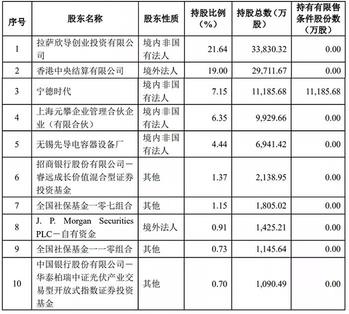近期,先導(dǎo)智能發(fā)布向特定對象發(fā)行股票發(fā)行情況報告書,截至2021年6月10日,先導(dǎo)智能此次發(fā)行股票總數(shù)量為111,856,823股,發(fā)行價格為22.35元/股,實(shí)際募集資金總額約人民幣25億元,扣除發(fā)行費(fèi)用(不含稅)后,實(shí)際募集資金凈額約人民幣24.88億元。此次發(fā)行股份的對象為寧德時代,此次發(fā)行后公司前十名股東情況如下表,寧德時代位列前十大股東。