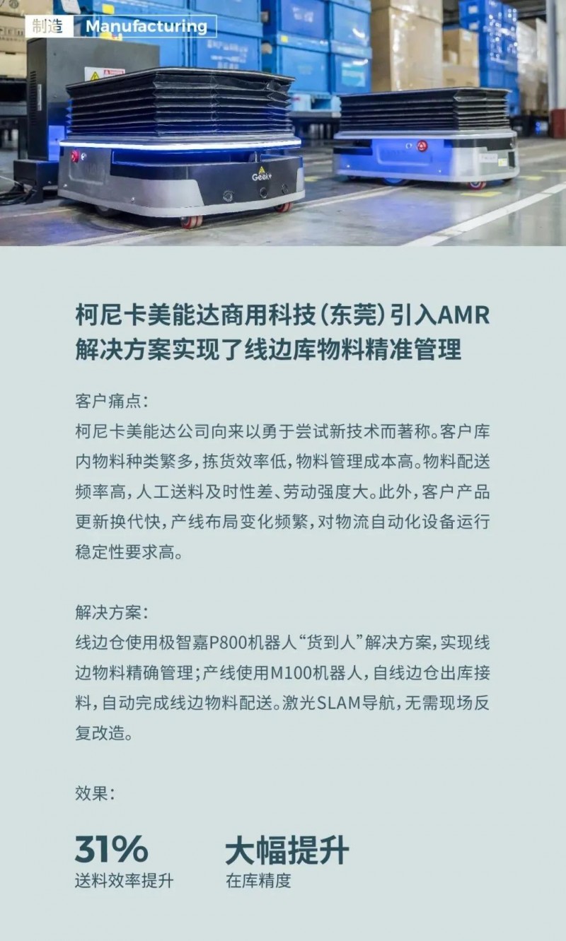 在綠色供應鏈方面,極智嘉通過智能物流機器人助力客戶在智能升級中減少工程實施,實現低碳供應鏈升級改造。某全球汽車零部件領軍企業上海工廠為實現生產物料在存儲區和線邊之間的搬運流轉,采用極智嘉搬運機器人,進行原料上線、空容器下線、成品下線作業,完成整個車間內的物料自動搬運。極智嘉的搬運機器人方案解決了客戶搬運效率低、物料管理難度大、路經長、送料頻次高、錯誤率高等問題,切實降低了搬運勞動強度,提高生產效率、減少物料浪費,助力工廠實現低碳制造。