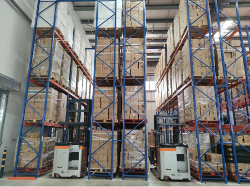 優異的性能使得VDA116三向叉車自推出以來就受到了眾多用戶的青睞。某食品配送公司,每天有大量的物料需要進出倉庫,之前都是采用地堆的方式存儲。隨著公司業務的不斷擴大,原本的存儲方式已經不能滿足他們現有的業務需求。只有將物料上貨架,在不改變現有倉儲面積的情況下,可以增加庫位。可是如果采用傳統貨架堆垛方式,在庫位的增加上并沒有很大的優勢,未來業務再擴張后,還將面臨儲位不足的問題??蛻舳喾奖容^后決定采用卓一的三向堆垛車來改造現在的倉庫。