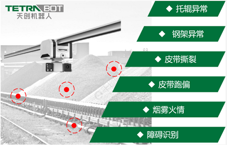 通過機器人搭載采集高清視頻圖像,利用巡檢AI算法,有效判斷皮帶跑偏,表面撕裂,路面灑落礦渣等設(shè)備故障或生產(chǎn)事故,并將告警信息及時反饋至控制中心,由工作人員及時進行處理。