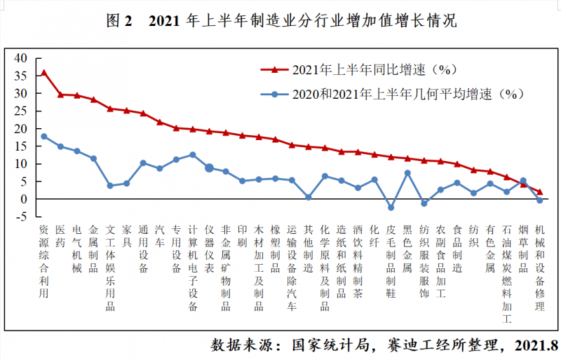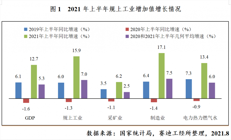 從整體看,2021年上半年工業(yè)生產(chǎn)呈恢復性增長態(tài)勢。上半年,工業(yè)增加值同比增長15.9%,增速較上年同期加快17.2個百分點;兩年平均增長7.0%,平均增速較2019年同期加快1個百分點,達2015年以來同期最高水平。