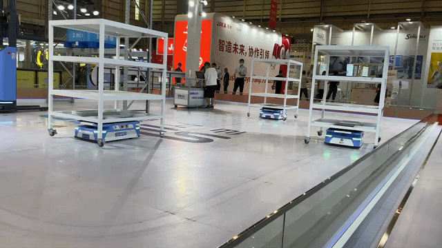 AMB-J 頂升機器人、SFL-CDD14 窄道應用自動叉車、復合機器人多臺移動機器人現場工作,專業技能同臺展示。