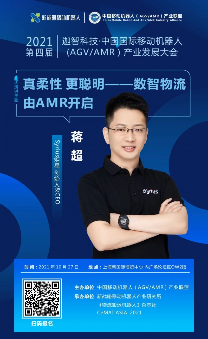 10月27日,在中國移動機器人(AGV/AMR)產業聯盟主辦的《第四屆國際移動機器人大會》上,Syrius炬星創始人兼CEO蔣超將帶來“真柔性 更聰明——數智物流由AMR開啟”主題分享,敬請期待!