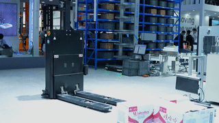 在國(guó)自展臺(tái)我們還看到一臺(tái)叉式機(jī)器人在展示平庫(kù)堆疊功能,機(jī)器人將兩疊壘放著較大體積的礦泉水托盤精準(zhǔn)地堆疊,給到場(chǎng)觀眾帶去較為直觀的感受。