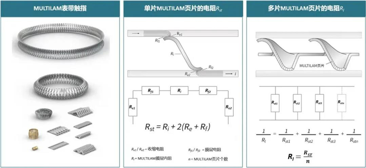 MULTILAM技術,也稱為表帶觸指技術,即在兩個接觸面之間建立平行接觸點,并且提供一定的接觸力,可以破壞污染層,實現有效的電連接。每一個接觸頁片形成獨立的彈性負載回路,通過一圈若干回路的并聯,能大大減少導體之間的接觸電阻。MULTILAM的接觸電阻Rl相當于并聯連接的接觸頁片的電阻。每一個接觸頁片的幾何形狀均為實現長久的工作壽命而設計。頁片恒定的彈性壓力可以使接觸界面之間的連接保持穩定,從而實現恒定的低接觸電阻。