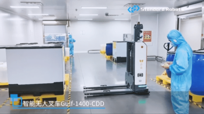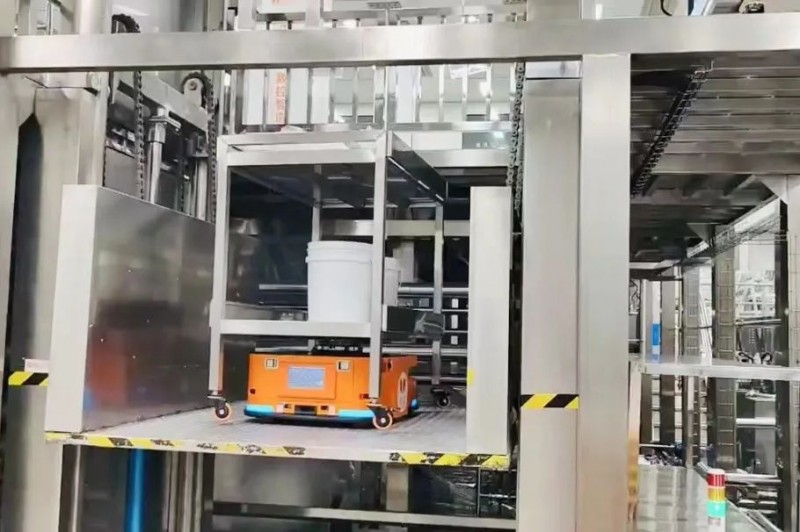 同時(shí),由Gulf-1400-CDD無(wú)人叉車機(jī)器人負(fù)責(zé)原材料從原料倉(cāng)到乳化車間的搬運(yùn)、空桶的產(chǎn)線返回、半成品從產(chǎn)線到車間的中轉(zhuǎn)、包材的產(chǎn)線搬運(yùn),搭配FMS調(diào)度管理系統(tǒng),實(shí)現(xiàn)最優(yōu)任務(wù)分配方案,讓倉(cāng)儲(chǔ)物流整體效能最大化。