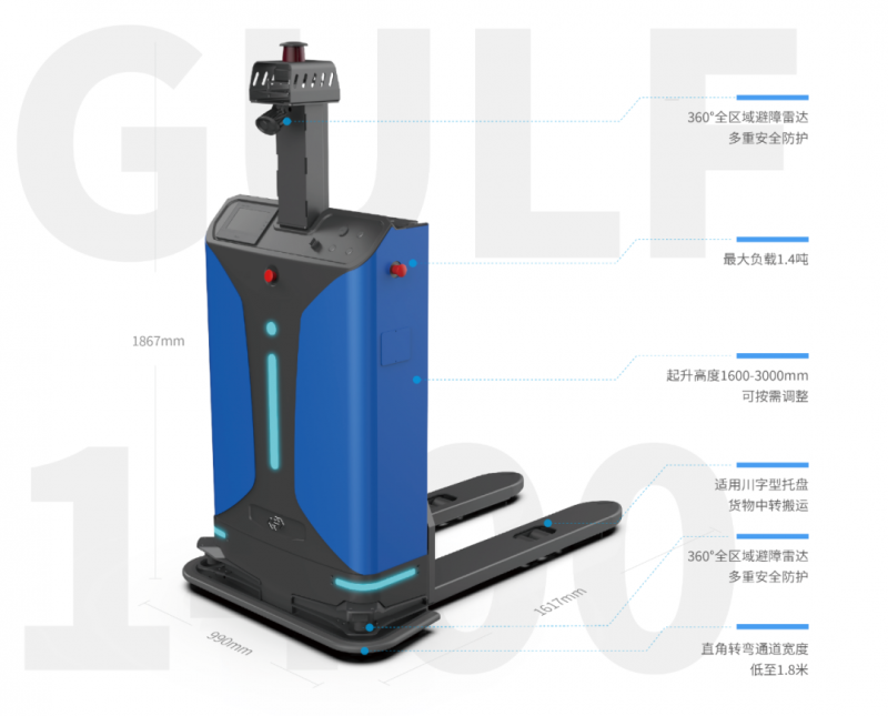Gulf-1400-CDD無(wú)人叉車采用斯坦德自研激光SLAM導(dǎo)航技術(shù),無(wú)需固定基礎(chǔ)設(shè)施改造即可完成部署運(yùn)行,同時(shí)通過(guò)托盤到位檢測(cè)傳感器、貨叉防撞傳感器、3D視覺(jué)相機(jī)、RFID等多傳感器融合技術(shù),實(shí)現(xiàn)智能高效安全取放料作業(yè)。