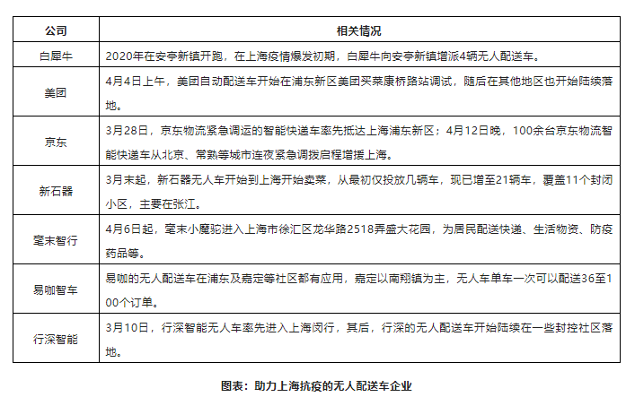 自疫情爆發(fā)后,白犀牛、新石器、易咖智車、毫末智行、行深智能等多家無人配送車企業(yè),第一時(shí)間馳援上海開展無人配送,協(xié)助商超抗疫保供,應(yīng)對訂單激增、運(yùn)力緊張所帶來的挑戰(zhàn)。