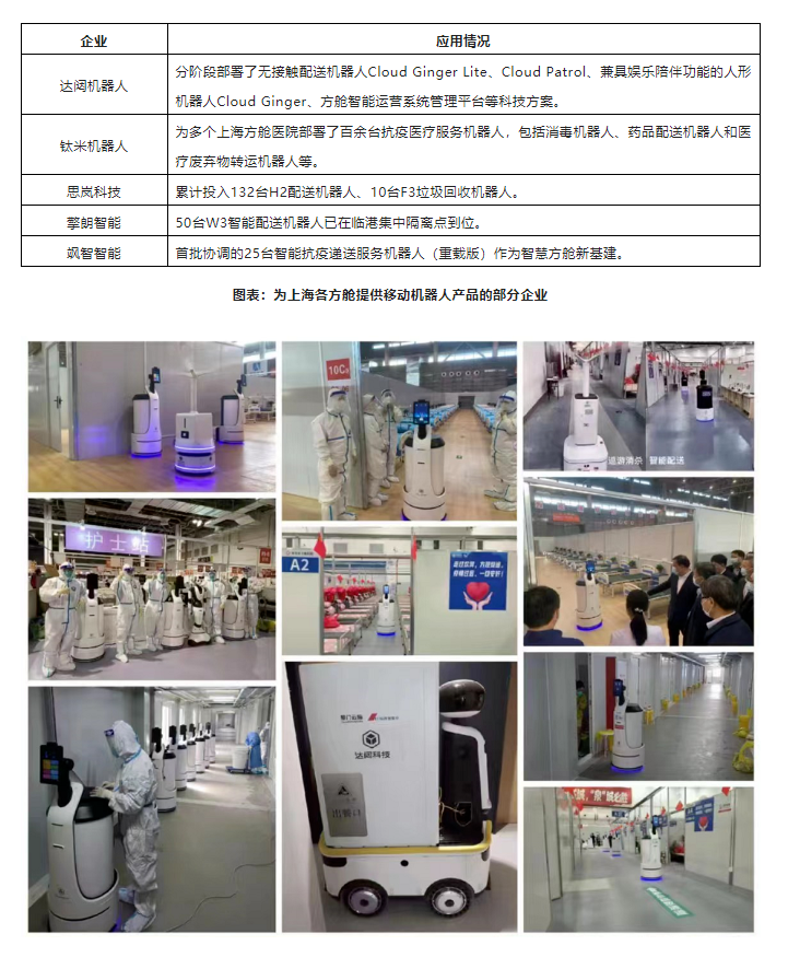 室內(nèi)場景中,主要以方艙醫(yī)院等隔離收治點(diǎn)應(yīng)用為主。本次疫情以來,上海已陸續(xù)啟用一批定點(diǎn)醫(yī)院和方艙醫(yī)院,其中臨港方艙應(yīng)用移動機(jī)器人數(shù)量最多。
