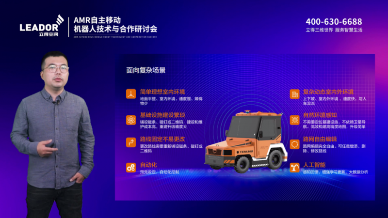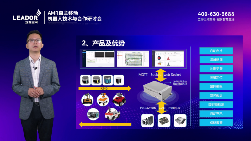 立得空間智能機器事業(yè)部銷售總經(jīng)理黃維分享了立得空間在AMR自主移動機器人領域的合作案例。他指出,立得空間利用核心技術和產(chǎn)品已為數(shù)千家底盤廠家賦能。其中,核心產(chǎn)品“路霸”機器人行進系統(tǒng)(PNS)采用3Dslam技術路線,經(jīng)過五年的迭代更新,適應各種復雜場景,在室內(nèi)外、上下坡、高速和人車混流等場景實現(xiàn)定位導航,滿足不同場景下的柔性導航需求。
