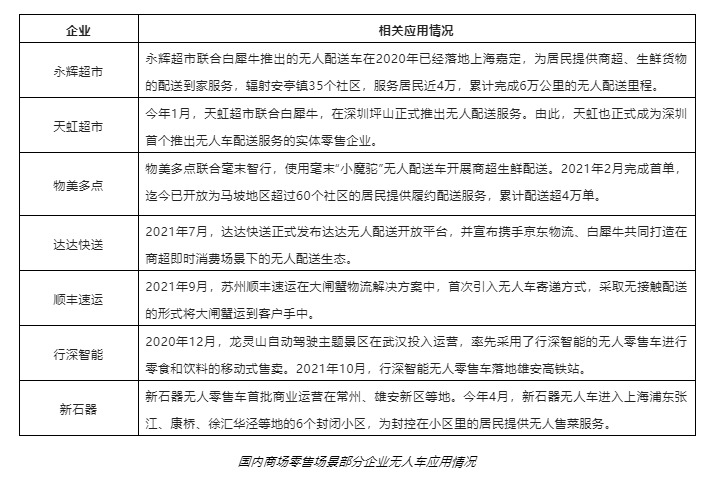 而商超配送方面,由于線下市場仍是主力,目前多以合作探索為主。如白犀牛與永輝超市、天虹超市,毫末智行與物美多點等,這些企業(yè)已經(jīng)在部分地區(qū)實現(xiàn)了常態(tài)化運營。